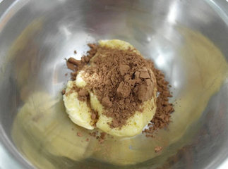 4、把面团分成2份~~~ 其中1份将可可粉加入混和均匀。