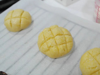 5、分别将这2份面团分成3等份~ 滚成圆形表面喷点水洒上砂糖并且划上格子状。