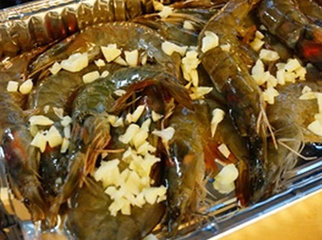 2 、准备烤盘,放上处理好的虾子,再放上蒜末。