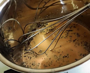 6 、将煮好放凉的奶茶、盐巴及香草精拌入。
