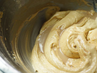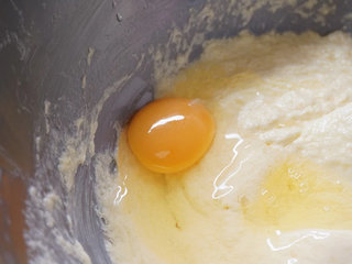 4 、再将蛋一颗一颗打入奶油糊中并拌至滑顺。 (一颗打入后用刮刀充分拌匀再放一颗)。