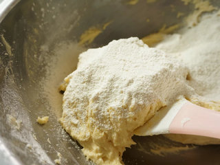 5 、将低筋面粉+无铝泡打粉 混合过筛后大约分3次加入奶油蛋糊中,刮刀由下往上轻轻将面糊拌匀即可。