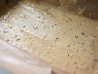 8 、将烤模铺上烤纸后,蛋糕糊倒入约7~8分满 (分量我用30cm X 9cm 的长型模刚好可以烤一个),进预热好的烤箱中以摄氏175度烤约45分钟即可。