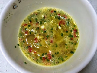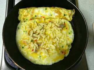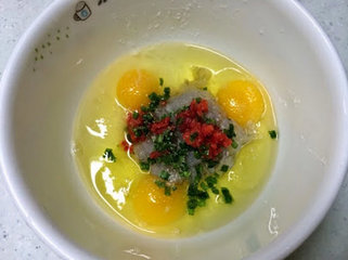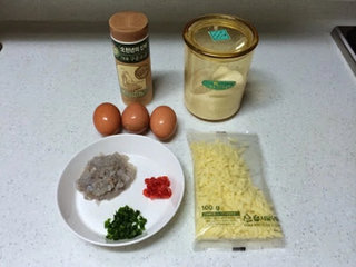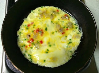 主料:鸡蛋三颗,虾子五只,韭菜少许,红椒少许,起司50克