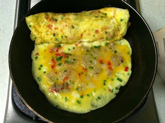 7 、再重覆一次刚刚的动作。 蛋汁分成少量多次煎较容易成功。
