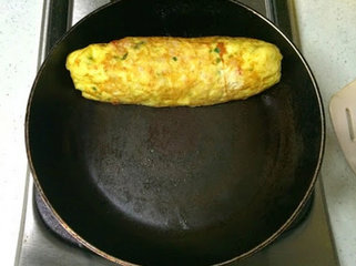 6 、卷好的部份重新推回锅子上面, 倒入一部份的蛋汁, 均匀的洒上起司后往下卷起。 卷不起来可以另外用汤匙辅助。
