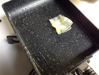 2 、将餐巾纸折成小小正方型,沙拉油1大匙(分量外)备用在旁。将沾沙拉油的餐巾纸将煎锅全面沾满沙拉油,用中小火加热30秒后,将锅底沾一下湿毛巾降温,然后再放上炉子,转小火。