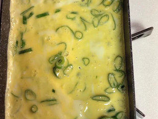 日式葱蛋烧,日本人最爱的家常菜之一,将满满的青葱,加入蛋液中,混合牛奶和美乃滋,再加上少许胡椒c和糖调味,就是一道平凡美味的玉子烧。