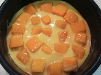4 、再将芒果提拉米苏糊倒入模具内,铺上一层芒果丁,再铺上芒果提拉米苏糊,铺上一层芒果丁糊,再铺上芒果提拉米苏糊即可, 放入冷藏库一晚到完全固定为止脱模时用热毛巾围在模型外围数秒,下面用个瓶子比底模还小的顶着,即可顺利脱模。