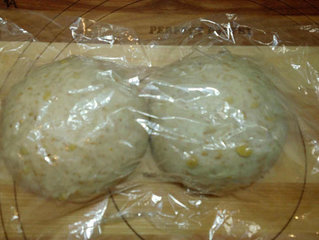 3 、再将面团切割成2等份后.然后揉圆.上面盖上塑胶袋.让水份不会散失.然后休息15分钟. (整型时会有些黏手.可以上些手粉)。