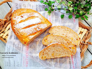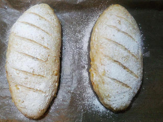 5 、当面包二次发酵完成之后.约涨成1.5倍大之后.表上洒上面粉后.在用刀子在面包上面划上斜线.烤箱预热180度后.烤25-30分钟..要注意不要烤焦..可在上面盖上铝薄纸即可。