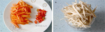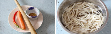 3、胡萝卜去皮切细丝,红辣椒去籽切圈。胡萝卜丝可以比牛蒡丝稍微粗一些,因为炒制后胡萝卜会变软。