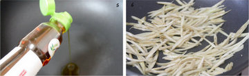 6、油温后倒入牛蒡丝,中大火翻炒,至牛蒡均匀的裹上芝麻油,稍稍变软。