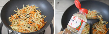 7、加入胡萝卜丝和辣椒,继续翻炒一会儿,至胡萝卜软身。