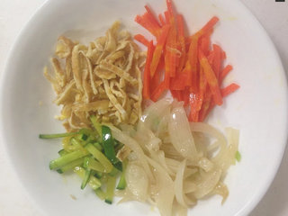 2、配料 1.蛋加一点盐巴打散后煎成蛋皮后切丝 2.洋葱、栉瓜、红萝卜切丝后分锅加盐调味炒熟 3.泡菜切碎。