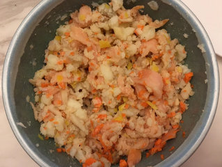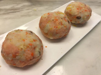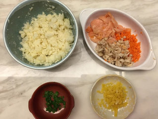 主料:鸡蛋1颗,马铃薯2颗,烟熏鲑鱼4-5片,柠檬皮一颗的量,红萝卜碎末2大匙,鸿禧菇10朵
