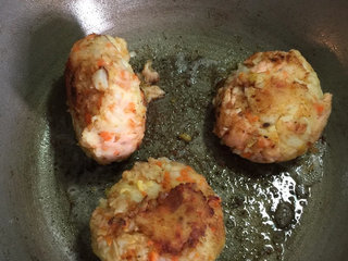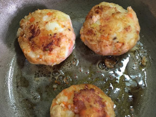 2、烟熏鲑鱼要尽量包在里面,马铃薯泥在外围,煎好的饼才不会碎掉。