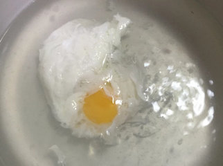 7 、汤锅水滚后,加入盐、白醋,以勺子做成漩涡,将鸡蛋放在漩涡中心,熄火,让热水将蛋泡熟,约3分钟。