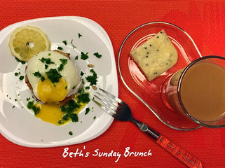 8 、水波蛋放在薯饼上,撒上欧芹,挤上一点柠檬汁,以叉子戳破蛋黄,开动了!