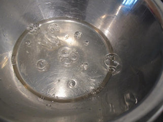 2 、吉利丁4片,泡冷水10分钟。 用手挤干冷水后,在小锅中最小火加热,直到吉利丁融化。静置。吉利丁不可沸腾。