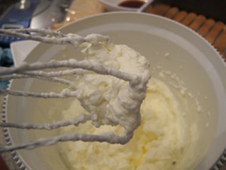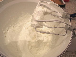 3 、鲜奶油打发,以电动搅拌机,最低速,直到鲜奶油呈现深纹路,举起不落即可。备用。