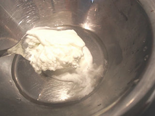 4 、冷热中和:将2大匙打发的鲜奶油,加入融化的吉利丁。调匀。这个步骤防止吉利丁遇冷结块。