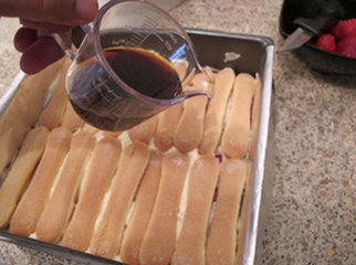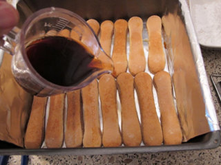 9 、排好浸泡过浓缩咖啡的拇指饼干。 在上方均匀淋上浓缩咖啡。