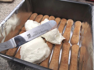 7 、取四分之一的马斯卡彭乳酪,铺在拇指饼干上方。