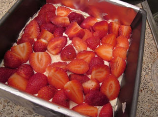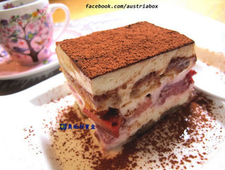 1、鲜草莓提拉米苏 制作步骤 活动式四角正方形烤模一个。20 x 20cm。 新鲜草莓去蒂,洗净,拭干,切片。备用。 烤模的活动底,铺上厚铝箔纸,留下两边长。脱模时,可以直接拉起。
