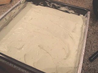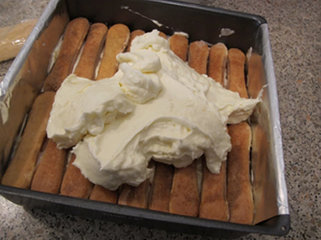 10 、将剩下的马斯卡彭乳酪铺上。 盖上保鲜膜或是铝箔纸。送入冰箱冷藏至少五个小时,隔夜更好。