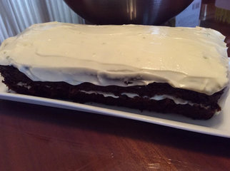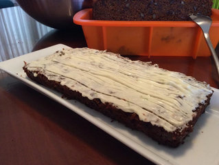 6 、将放凉的红萝卜磅蛋糕从中间切一半,抹上一层薄糖霜,再将另外切一半的放上去即可,如果不想全部涂上糖霜,这样就是有内馅的红萝卜蛋糕。