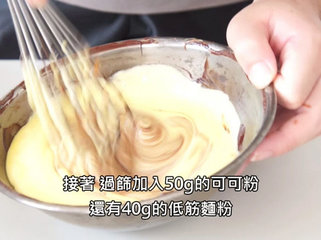 6 、巧克力糊可可粉、低筋面粉过筛加入,拌匀。