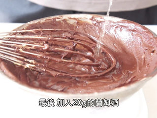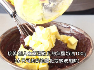 7 、巧克力糊室温软化的奶油加入,拌匀。