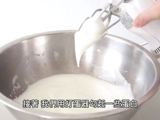 9 、蛋白霜蛋白不加糖,打到湿性发泡。