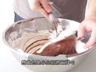 11 、在巧克力糊中,先加入1/3蛋白霜到且巧克力糊中,拌匀。