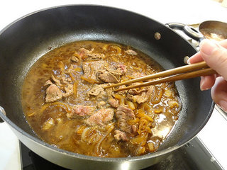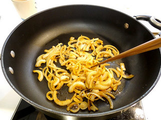 2 、将洋葱切丝下锅炒软,再将鸡高汤、酱油、味Y、米酒倒入锅中煮滚。