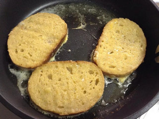 3 、将平底锅放入1块约20公克的奶油,充分热锅之后,将面包放入两面中小火煎香。(一面各煎约一分半钟)。放入盘子上,上面撒上粉糖即可享用。
