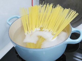 6、在煎虾的时候可以同时煮义大利面喔。