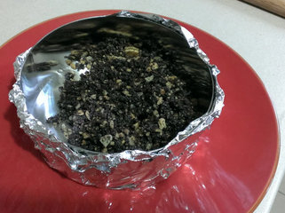 2、饼干底苦甜巧克力隔水加热融化,混入步骤1饼干屑中。取一个6寸慕斯圈,底包铝箔纸、下面垫一个盘子较好操作。将混好的巧克力饼干倒入、压紧,放进冷冻30分钟-1小时。