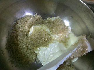 3、蛋糕面糊回温的奶油乳酪+柠檬皮末砂糖,以隔水加热方式,搅拌至砂糖融化。