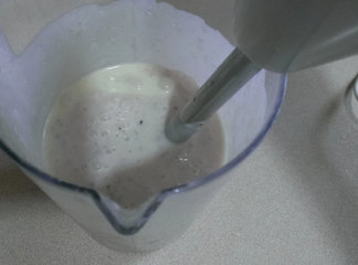 5、加入新鲜蓝莓,稍微果汁机搅打,留下一点颗粒有点缀效果。最后加入柠檬汁再搅打10秒。