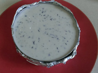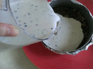 6、将步骤2完成的饼干底从冷冻取出,此时饼干底应该变硬且成一体,将步骤5完成的乳酪面糊缓缓倒入模型中。