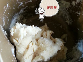 4 、将菠萝皮奶油先用电动打蛋器打发,加入糖粉拌匀,再将半个蛋液倒入拌匀,将高低粉过筛加入,用软刮刀拌匀成无粉状,刮入塑胶袋整成长条型,放入冰箱冷藏半小时即可用。