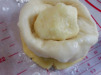 9 、将菠萝皮揉圆沾粉压扁,取一面团拍打捏扁放在菠萝皮上,再放入奶酥在面皮上方。