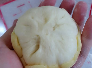 10 、将沾有菠萝皮的面团拿起放至掌心,先将面团像包包子一样把奶酥包合,利用手掌拢合的方式把菠萝皮往上尽量推开,不要推太薄。
