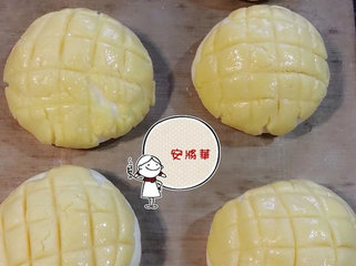 11 、把包好的面团收口朝下,菠萝皮朝上,排放在烤盘上,用刮刀在菠萝皮上切线,不要太大力压扁面团,也可不切,烤好会有自然裂痕。
