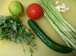 1、芦笋做凉拌用要选择长的, 短的芦笋较适合用炒的料理,白芦笋适合煮汤。 小黄瓜,番茄切丁。九层塔,蒜头切末备用, 卢笋从底部的地方撕表面粗丝后,或用刨刀, 切掉一点底部的部分。