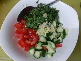 2 、沙拉酱料: 取一碗装小黄瓜丁,番茄丁,九层塔碎末, 先把糖,盐巴加好备用。