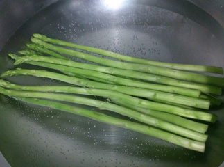 4 、撕完外表粗皮的芦笋起一锅热水烫3分钟。