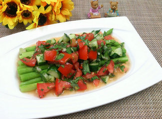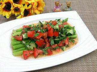 配料:番茄一颗,小黄瓜半条,九层塔适量,小蒜头5颗,食用油1.5大匙,盐巴适量,糖适量,柠檬汁半颗量